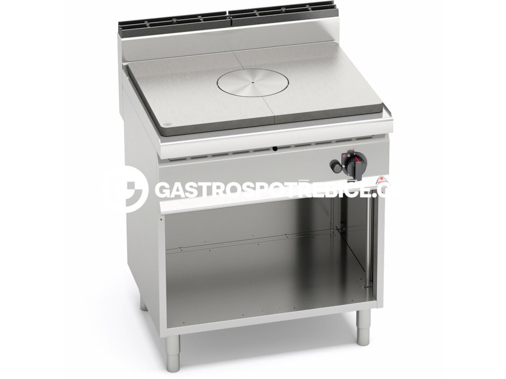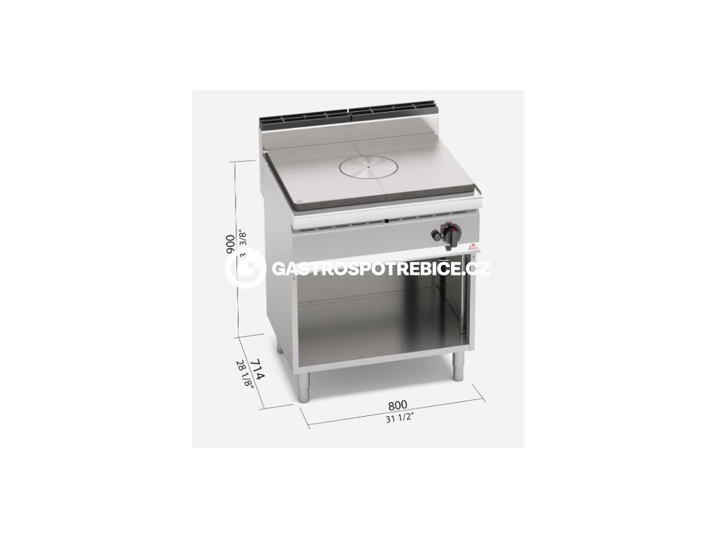 Vařící plotna je vhodná pro přípravu velmi chutných pokrmů z tradiční kuchyně. Nepřímé zásobování teplem je vhodné zejména při přípravě omáček a pokrmů, které potřebují pomalé vaření při konstantní teplotě. Je velká se zcela hladkým povrchem, který tak usnadňuje použití široké škály druhu nádobí a zaručuje snadnou čistitelnost. Vnitřní žáruv-zdorná izolační vrstva s maximální schopností usměrnění tepla, které je soustřeďováno na střed plotny a nabízí tak vynikající komfort a bezpečnost při vaření. Plynový sporák s ocelovou plotnou velké tloušťky s rozdílnými oblastmi teplot: max. teplota na středu, klesající na okrajích. Ohřev zajišťuje střední litinový hořák 13kW s regulací výkonu. Zapalování hořáků věčným plamínkem. Kompaktní provedení s otevřeným podstavcem. Elektrické a plynové tálové sporáky s rovnou varnou plochou pro optimální manipulaci s nádobím. Elektrické tálové vařidlo s regulací jednotlivých varných zón (4x 2,25kW), u plynového tálového vařidla je ohřev zajištěn výkonným středovým litinovým hořákem (10 kW). Plynový model muže být dodán pouze s plynovou troubou (GN 2/1 o výkonu 7,8kW). Elektrické modely jsou dodávány s elektrickou multifunkční troubou FE - statická pro GN 2/1 s ovládáním jednotlivých spodních a horních těles (4,5 + 3kW), nebo horkovzdušnou troubou FE1 - ventilovaná pro GN 1/1. Tálová vařidla E7TPM a G7TPM v základu dovávána bez dvířek (viz. příslušenství - křídlová dvířka 2P).Doplňkové parametry