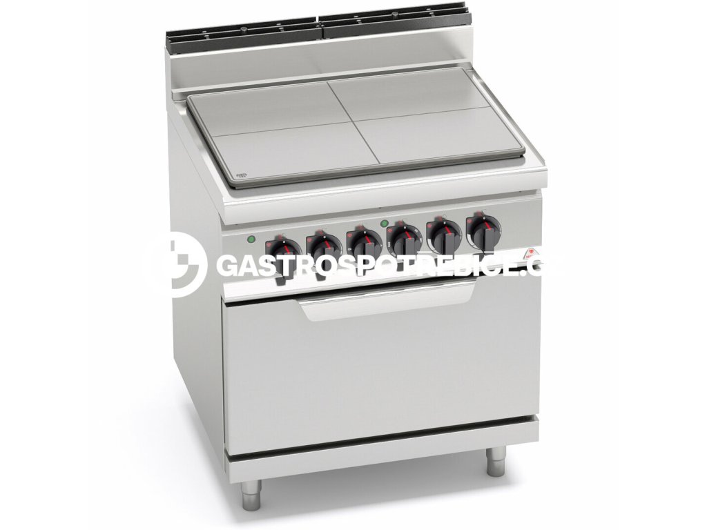 Sporák s troubou je vybaven varnými plotýnkami z litiny. Pracovní plochu lze doplnit o ocelovou výplň prostoru mezi plotnami, čímž se dosáhne celistvé pracovní plochy. Teplota je regulována nezávisle nastavitelnými spínači. Přímá kontrola teploty umožňuje významně uspořit energie. Topná tělesa jsou hermeticky uzavřena v jednom celku, který je lisován v rovině do varné desky. Pracovní plocha a opláštění z nerez oceli AISI 304. Litinová varné plotýnky s bezpečnostním termostatem a regulací výkonu. Kompaktní provedení s otevřeným podstavcem. Konvekční trouba vhodná pro GN 1/1, nebo model se statickou multifunkční troubou pro GN 2/1. Trouby mají nově zesílené litinové dno a jsou vybaveny kvalitním těsněním dveří. Elektrické a plynové tálové sporáky s rovnou varnou plochou pro optimální manipulaci s nádobím. Elektrické tálové vařidlo s regulací jednotlivých varných zón (4x 2,25kW), u plynového tálového vařidla je ohřev zajištěn výkonným středovým litinovým hořákem (10 kW). Plynový model muže být dodán pouze s plynovou troubou (GN 2/1 o výkonu 7,8kW). Elektrické modely jsou dodávány s elektrickou multifunkční troubou FE - statická pro GN 2/1 s ovládáním jednotlivých spodních a horních těles (4,5 + 3kW), nebo horkovzdušnou troubou FE1 - ventilovaná pro GN 1/1. Tálová vařidla E7TPM a G7TPM v základu dovávána bez dvířek (viz. příslušenství - křídlová dvířka 2P).Doplňkové parametry