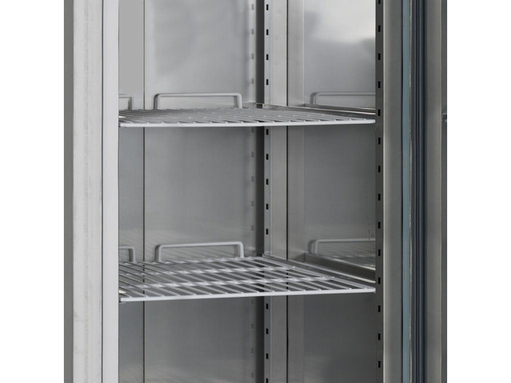 Řada chladicích skříní RK s 1 nebo 2 plnými dveřmi je určena pro profesionální kuchyně a má nastavitelné police o rozměrech GN2/1. Chladicí skříň je vyrobena z vysoce kvalitní nerezové oceli SS304 vhodné pro gastronomii a má odolná kolečka pro snadnou manipulaci, což se hodí při úklidu kuchyně. Ventilované chlazení zajišťuje rovnoměrnou teplotu uvnitř celé skříně, tu lze nastavit na digitálním termostatu. U modelu RK 710 lze měnit otevírání dveří, je nutné dokoupit levý pant. nerezová ocel|ventilované chlazení|samozavírací dveře se 105° zarážkou|zámek|nastavitelné police GN 2/1|odolná kolečkaDoplňkové parametry