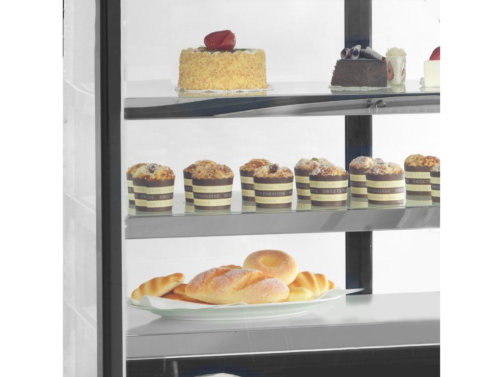 Cukrářské chladicí vitríny TEFCOLD LPD jsou díky svému odernímu designu skvělou volbou pro vystavení cukrářských a lahůdkářských produktů. Díky LED osvětlení ze spodní strany každé police je zboží krásně nasvětleno a láká zákazníky k ochutnání vystavených produktů. Police jsou nastavitelné a je tak možné přizpůsobit jejich výšku nárokům každé cukrárny či kavárny, jelikož je zde dostatek místa i pro vyšší dorty. rám z nerezové oceli a lesklého černého skla|LED osvětlení pod každou policí|nastavitelné police (jeden krok)|zadní prosklené posuvné dveře|nastavitelné nožky a kolečka|rovné přední sklo|dvojité sklo|přední sklo s ochranou proti mlženíDoplňkové parametry