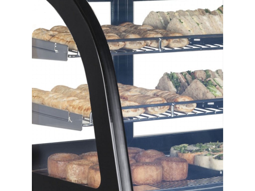 Vitrína je vhodná pro umístění zákusků, dortů, sendvičů či baget. Výrobky k prodeji lze umístit na dvou pevných roštových policích a na spodní výstavní ploše. Oblé přední sklo, prosklené boky a LED osvětlení zajišťují ideální viditelnost prodávaného zboží. nerezová ocel|dvojité sklo|zadní prosklené posuvné dveře|nastavitelné nožky|oblé předné sklo|vnitřní LED osvětlení|ventilované chlazeníDoplňkové parametry