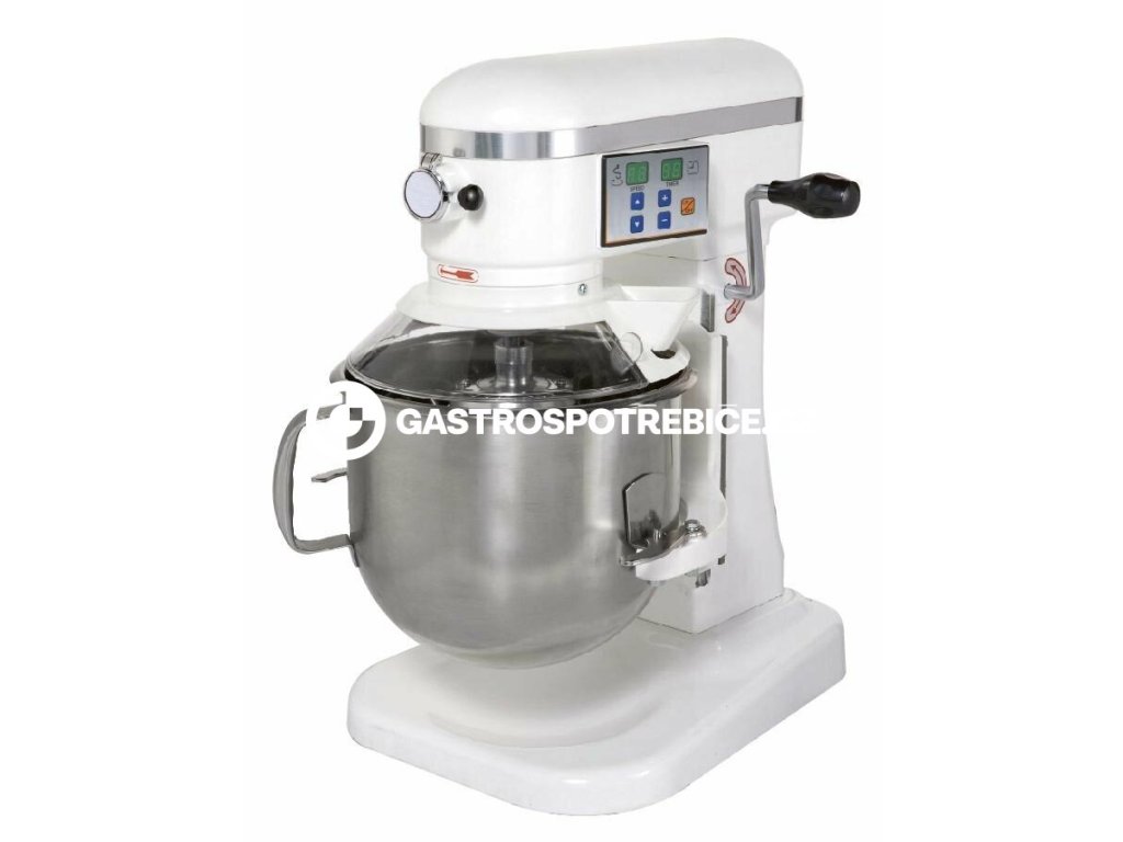 Univerzální kuchyňský robot DM-10A s objemem kotlíku 9,5 litrů vybaven základní sadou nástavců (sada obsahuje kotlík, metlu, míchač a hák). Uvedený model je navíc vybaven nábou pro připojení přídavných zařízení*. Robot je vybaven snadným elektronickým ovládáním s displeji pro volbu času (1-30 min.nebo trvalý chod) a volbu rychlosti (volitelných 10 rychlostí - bez nutnosti zastavení stroje) zařízení dále zvukově signalizuje ukončení pracovního cyklu. Robustní konstrukce stroje a gumový návlek na podestě zabezpečuje dobrou stabilitu a odolnost i při hnětení tuhého těsta. Planetové uložení otáčení nástavců (otáčí se v ose a zároveň obíhá po kružnici). *K uvedenému zařízení výrobce aktuálně nedodává a nejsou dostupná přídavná zařízení. ■ Ochranný kryt s násypným otvorem ■ Vybaven digitálním časovačem (1-30min.) ■ Trvalý chod s volbou rychlosti (bez zastavení stroje) ■ Displej zobrazující nastavení času a rychlosti ■ Zvuková signalizace ukončení cyklu ■ Tepelná ochrana při přetížení ■ Robustní konstrukce ■ Možnost připojení přídavných zařízení (prozatím výrobce nenabízí)Doplňkové parametry