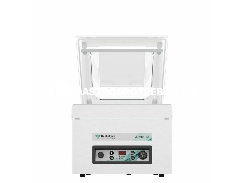 Prodlužte trvanlivost masa, drůbeže, ryb, sýrů, zeleniny a dalších potravin včetně tekutin. Ochraňte je před působením vnějších vlivů. S výkonnou, profesionální a spolehlivou jednokomorovou vakuovou baličkou Jumbo 42 od holandské firmy Henkelman to půjde snadno. Vakuová komora se zaoblenými rohy má délku komory 370 mm, šířku lišty (max. šířka sáčku) 410 mm a výšku komory 180 mm a dokonale uchová trvanlivost produktů. Bezdrátová těsnící lišta s dvojitým svárem (2 × 3,5 mm) je jednoduše vyjímatelná pro snadnou údržbu. Uvnitř vakuové komory je vložena speciální deska (lehce odnímatelná), ta slouží ke správnému umístění produktu určeného k vakuování a zkrácení délky vakuovacího cyklu. Šikmá vložka slouží k vakuování tekutin. Výkon vývěvy je 16 m3/h. Pohon a provedení Průhledné vypouklé krycí víko je vyrobeno ze speciálního odolného akrylového skla a rám vnějšího víka je z ušlechtilé oceli. Opatřeno automatickým otevíráním. Pohon je zajišťován napájením o 230 V s příkonem 0,55 kW. Robustní vakuová balička je vyrobena z nerezové oceli. Ovládá se na ovládacím panelu digitálně s časovým řízením vakua a svařování. Program je jeden a je nastaven na základní režim. Ovládání senzorem vakua (příplatkově), snadné a přesné nastavení požadovaného vakua na digitálním ovládacím panelu s časovým řízením svařování. Balička je dále vybavena automatickým servisním programem údržby vakuového čerpadla Busch. Doba celého vakuovacího cyklu je 20-40 vteřin.Doplňkové parametry