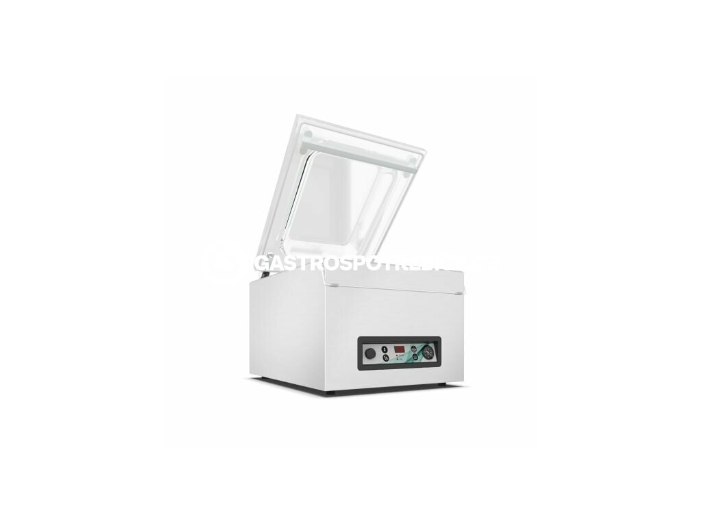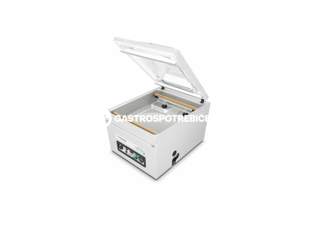 Prodlužte trvanlivost masa, drůbeže, ryb, sýrů, zeleniny a dalších potravin včetně tekutin. Ochraňte je před působením vnějších vlivů. S výkonnou, profesionální a spolehlivou jednokomorovou vakuovou baličkou Jumbo 42XL od holandské firmy Henkelman to půjde snadno. Vakuová komora se zaoblenými rohy má délku komory 410 mm, šířku lišty (max. šířka sáčku) 420 mm a výšku komory 180 mm a dokonale uchová trvanlivost produktů. Dvě bezdrátové tavící lišty s dvojitými sváry (2 × 3,5 mm) jsou jednoduše vyjímatelné pro snadnou údržbu. Druhá lišta zvyšuje účinnost balení. Uvnitř vakuové komory je vložena speciální deska (lehce odnímatelná), ta slouží ke správnému umístění produktu určeného k vakuování a zkrácení délky vakuovacího cyklu. Šikmá vložka slouží k vakuování tekutin. Výkon vývěvy je 16 m3/h. Provedení a pohon Během vakuování u této baličky dochází k přidání ochranné atmosféry (plynu). Přidáním těchto plynů dochází ke zvýšení ochrany a zabraňuje se nežádoucí změně zabarvení výrobků. Maximální šířka vakuovacího sáčku je 420 mm. Průhledné vypouklé krycí víko je vyrobeno ze speciálního odolného akrylového skla a rám vnějšího víka je z ušlechtilé oceli. Opatřeno automatickým otevíráním. Pohon je zajišťován napájením o 230 V a příkonem 0,55 kW. Robustní vakuová balička je vyrobena z nerezové oceli. Ovládá se na ovládacím panelu digitálně s časovým řízením vakua a svařování. Program je jeden a je nastaven na základní režim. Vakuová balička je opatřena standardní časovou kontrolou a automatickým servisním programem údržby vakuového čerpadla Busch. Údržba Doba celého vakuovacího cyklu je 20-40 vteřin. Údržba na pročištění oleje v čerpadlu se spustí jednoduše tlačítkem po uzavření víka. Doporučujeme čerpadlo pročišťovat vždy alespoň jednou za týden. Čistitelnost je jednoduchá. Ideální pro gastronomické provozy, veřejné stravování, maloobchody, ale také pro kuchyně restaurací a hotelů. Speciální deska ke správnému umístění produktů Ovládání – digitální Program – jeden, základní Provedení: nerezDoplňkové parametry
