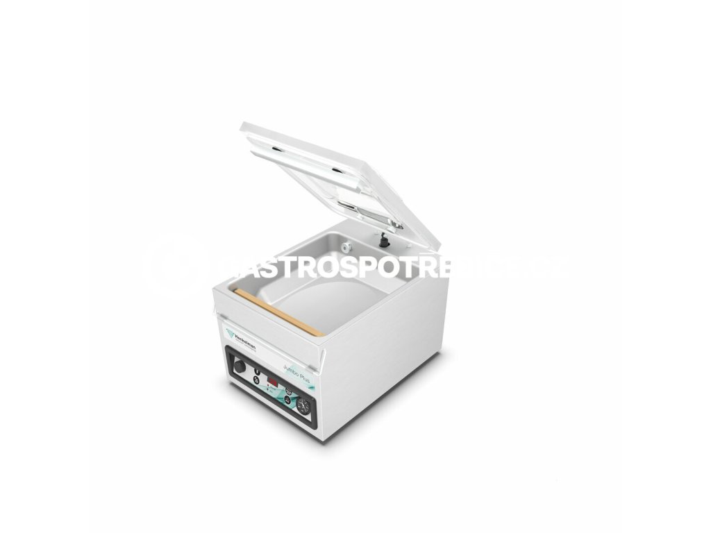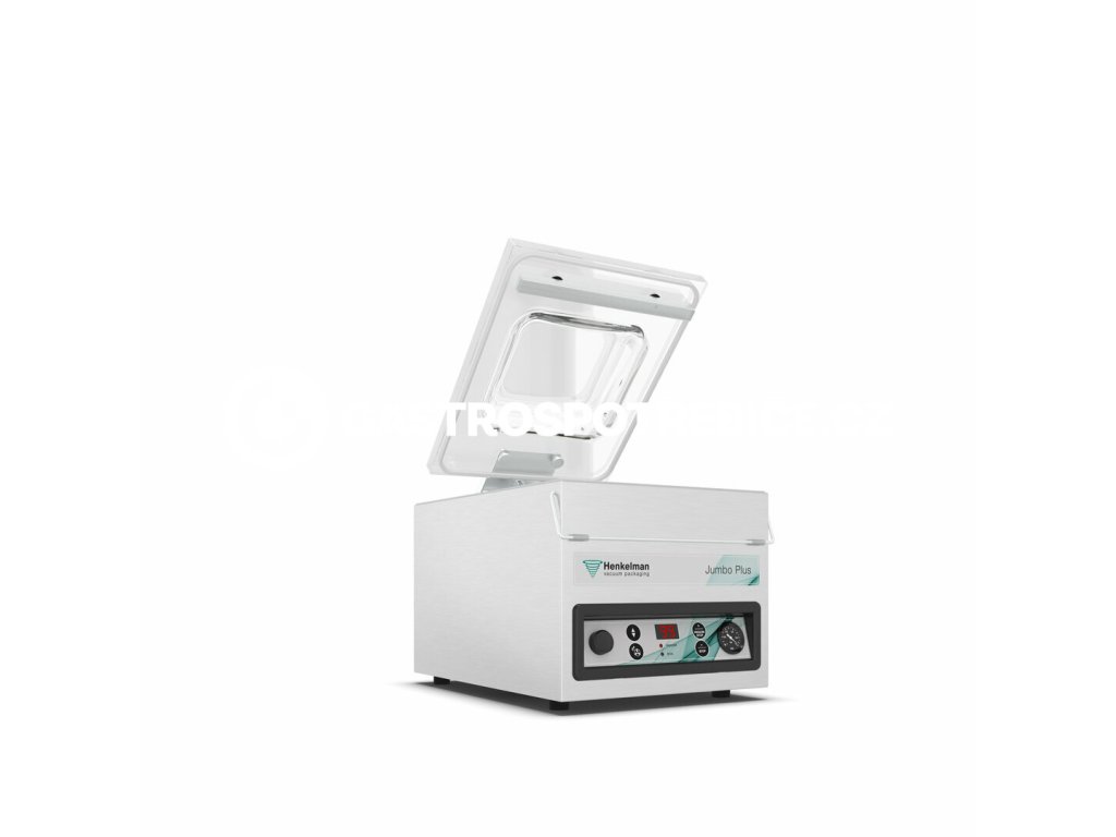 Prodlužte trvanlivost masa, drůbeže, ryb, sýrů, zeleniny a dalších potravin včetně tekutin. Ochraňte je před působením vnějších vlivů. S výkonnou, profesionální a spolehlivou jednokomorovou vakuovou baličkou Jumbo Plus od holandské firmy Henkelman to půjde snadno. Vakuová komora se zaoblenými rohy má délku komory 310 mm, šířku lišty 263 mm (max. šířka sáčku) a výšku komory 130 mm a dokonale uchová trvanlivost produktů. Bezdrátová těsnící lišta s dvojitým svárem (2 × 3,5 mm) je jednoduše vyjímatelná pro snadnou údržbu. Uvnitř vakuové komory je vložena speciální deska (lehce odnímatelná), ta slouží ke správnému umístění produktu určeného k vakuování a zkrácení délky vakuovacího cyklu. Šikmá vložka slouží k vakuování tekutin. Výkon vývěvy je 8 m3/h. Pohon a provedení Průhledné "vypouklé" krycí víko je vyrobeno ze speciálního odolného akrylového skla a rám vnějšího víka je z ušlechtilé oceli. Opatřeno automatickým otevíráním. Pohon je zajišťován napájením o 230 V s příkonem 0,4 kW. Robustní vakuová balička je vyrobena z nerezové oceli. Ovládání senzorem vakua, snadné a přesné nastavení požadovaného vakua na digitálním ovládacím panelu s časovým řízením svařování.Doplňkové parametry
