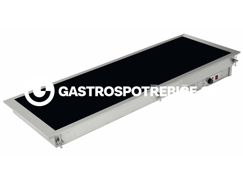Vestavná sklokeramická ohřevná deska v celonerezovém provedení s mechanickým termostatem a regulací (od +40° do +120°C) s centrálním vypínačem a kontrolkou chodu. Vhodná pro GN1/1. Deska je opatřena polohovatelnými kotvícími prvky, které společně s lemem desky zajišťují přilnavost k celé ploše pracovní desky. Vestavbu je možno příplatkově doplnit o hygienický zákryt (příprava). Plochá ohřevná deska vyrobená z keramického skla, speciálně navržená pro uchovávání, zobrazování a distribuci horkého jídla prezentovaného na talířích nebo mělkých pánvích a nerezových, smaltových GN 1/1. Ohřevná vestavná deska je vyrobena z vysoce kvalitní nerezové oceli pro náročné profesionální provozy, vysoce odolná sklokeramická deska zcela plochá s tloušťkou 4 mm. Vytápěcí systém skrytými silikonovými odpory připevněnými ke spodní části ohřevné desky. Křemíkové rezistory umožňují velmi rychle dosáhnout požadované pracovní teploty sklokeramické desky rovnoměrně po celé ploše a zajistit tím efektivní přenos tepla na vložené ohřevné nádoby, misky a jídlo do nich uložené. Připraven pro volitelnou instalaci hygienického zákrytu (neutrální / se světlem / se světlem a ohřevem), který lze snadno připevnit k vestavbě. Speciální svorky po stranách vestavby zajišťují fixaci a rovnoměrné uložení a přilnavost po celé ploše k desce stolu. Regulace teploty: od +40°C do 120°C. Napájení: 230V/1N/50Hz Kapacita: 2/1 GN Kapacita: 3/1 GN Kapacita: 4/1 GN Provedení: hladkáDoplňkové parametry