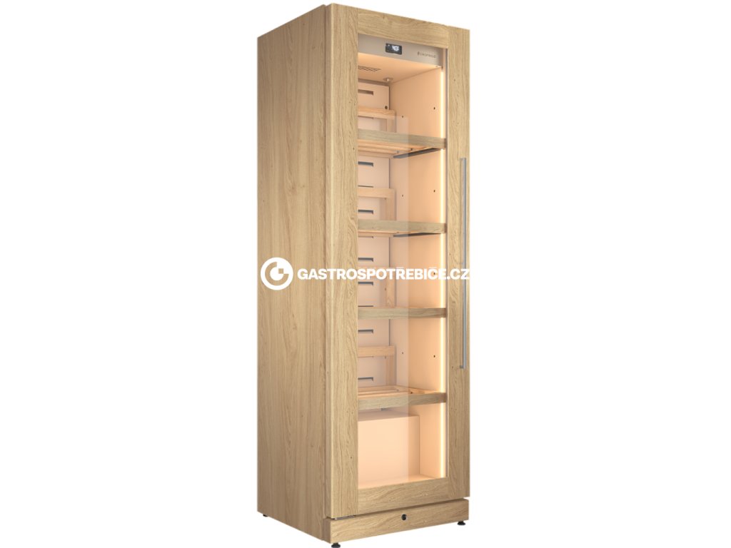 Model WNC6S nabízí elegantní design a vynikající technické parametry v kompaktním provedení s větší hloubkou. Je ideální volbou pro vinotéky, restaurace a degustační prostory, kde je kladen důraz na prezentaci, tichý provoz a optimální podmínky pro skladování vína. Díky své zúžené hloubce 660 mm je ideální volbou pro místa s omezeným prostorem, aniž by byla ohrožena vizuální atraktivita či výkonnost. Vinařská tradice se ve vitríně New California setkává s klasickými a esenciálními liniemi. Dřevo, tradičně ušlechtilý prvek nábytku, se svými bohatými nuancemi a barvami umocňuje prezentaci vašich nejlepších vín. Důraz na detail a vysoce kvalitní materiály pozvedají klasické prostředí a ponořují hosty do chutí a tónů nabídky jídel a vín v podniku. Dřevěná police dodává vitríně hřejivost, eleganci a podtrhuje její sofistikovaný vzhled. V ceně jsou 4 police na stojící láhve (každá po 30 ks). V případě zájmu je možnost zakoupení i jiných polic. Technický popis: Tělo z integralní pěny s hloubkou izolace 65 mm pro vynikající energetickou účinnost Lakovaný vnitřní korpus – estetický a snadno čistitelný Vnější opláštění z laminované desky – odolné, elegantní a sladěné s interiérem Dveře s dřevěným rámem v barvě opláštění, osazené dvouvrstvým nízkoemisním sklem Zámek pro bezpečné skladování vína Ventilovaný chladicí systém s termostatickou regulací teploty (rozsah 4–18 °C) Statická kondenzace – zajišťuje maximálně tichý provoz, vhodný do klidného prostředí Vnitřní LED osvětlení zabudované po stranách pro rovnoměrné nasvícení celé vitríny Zásobník na kondenzát, není nutné připojení na odpad Model je vybaven 4 základními policemi Vnitřní vybavení (jiné typy polic a zásvek) se objednávají samostatně (zásuvka na položené lahve, trubková police pro nakloněné ukládání a prezentaci lahví, případně další příplatkové úpravy a výbava viz.katalog) Kompaktní rozměry, vysoká hodnota Rozměry: 654 × 660 × 2020 mm Elegantní design se dřevěným rámem dveří, ladícím s barevným provedením vitríny Vhodné pro prezentaci a uchování vín v profesionálním prostředí – restaurace, vinotéky, degustační prostory Vysoce přizpůsobitelný interiér Možnost osazení výsuvnými dřevěnými zásuvkami nebo policemi pro lahve ve svislé i šikmé poloze Vnitřní uspořádání v souladu s požadavky zákazníka – pozice lahví nastavitelná horizontálně, vertikálně i diagonálně Vizuální přehlednost a snadný přístup díky výsuvnému mechanismu a kvalitnímu LED osvětlení Možnoti vnitřního uspořádání: 4 police pro stojící láhve (každá na 30 lahví typu bordó) - základní provedení - v ceně 12 výsuvných zásuvek pro horizontální uložení lahví (každá na 4 lahví) - možnost přikoupit 12 výsuvných zásuvek pro vertikální uložení lahví (každá na 5 lahví) - možnost přikoupit 4 šikmé tubusové police (každá po 18 lahví) - možnost přikoupit Dostupné vnější provedení vinoték (do poptávky prosím uveďte, o jakou barvu máte zájem) Tmavé Popelavě bílá Hrubý povrch SvětléDoplňkové parametry