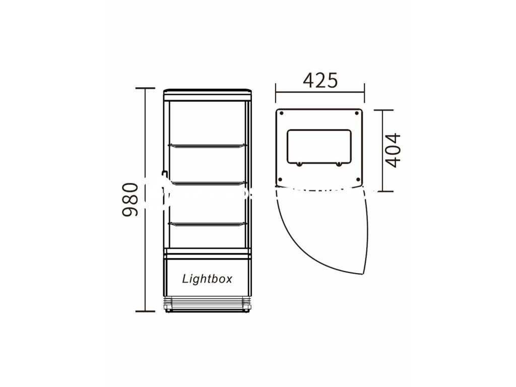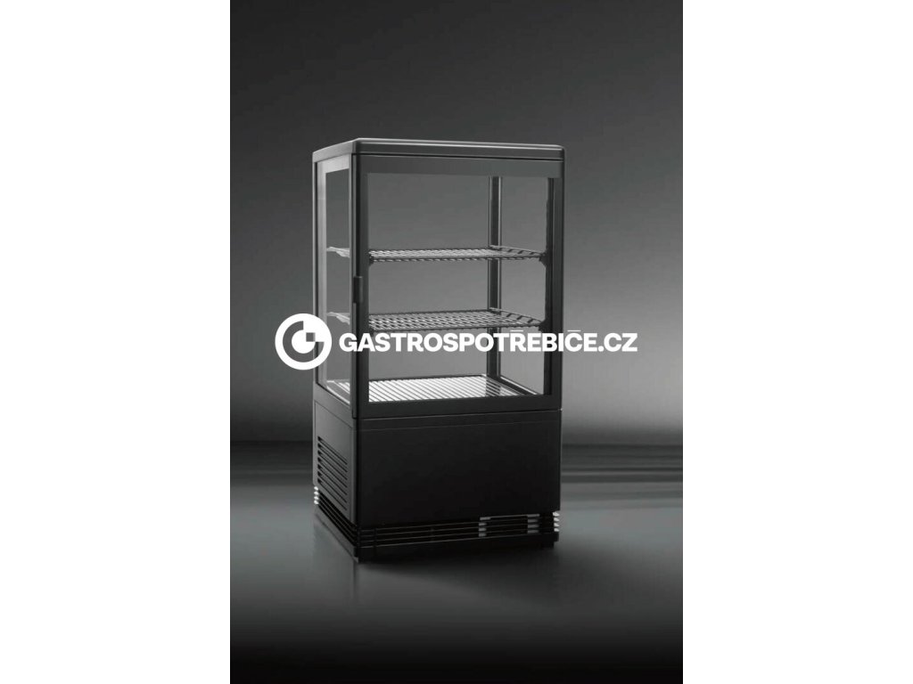 Chladicí panoramatická vitrína RT-78L(1R) určena k prezentaci, uskladnění a prodeji potravin a nápojů. Vitrína je v elegantním černém provedení ze všech stran prosklená (dvojitá izolovaná skla) přední strana s dvířky je v oblém provedení včetně skla, intenzivní oboustranné LED osvětlení, které neohřívá vnitřní prostor a výrazně napomáhá prezentaci a prodeji potravin ve všech patrech. Vitrína je ovládána elektronickým regulátorem se zobrazením teplot. Ventilovaný chladící systém s automatickým odtáváním. Výškově nastavitelné 3 police potažené PVC.Doplňkové parametry