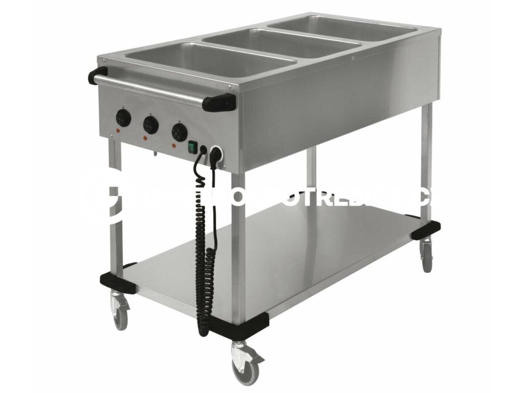 Celonerezový pojízdný výdejní stůl s vyhřívanou vodní lázní, v robustním provedení bez, nebo se spodní policí pevně spojenou s nohami, které jsou osazeny pojezdovými kolečky (2x brzděná). Vrchní deska s jednotlivými lisovaným vanami, každá samostatně regulována a vybavena výpustným ventilem. Modely MB(P) - ovládání a přívodní kabel je umístěn na čelním panelu vozíku. Ceny jsou uvedeny bez GN ! P - provedení se spodní policí Materiál: nerez Velikost vany: 2x, 3x, 4x GNDoplňkové parametry