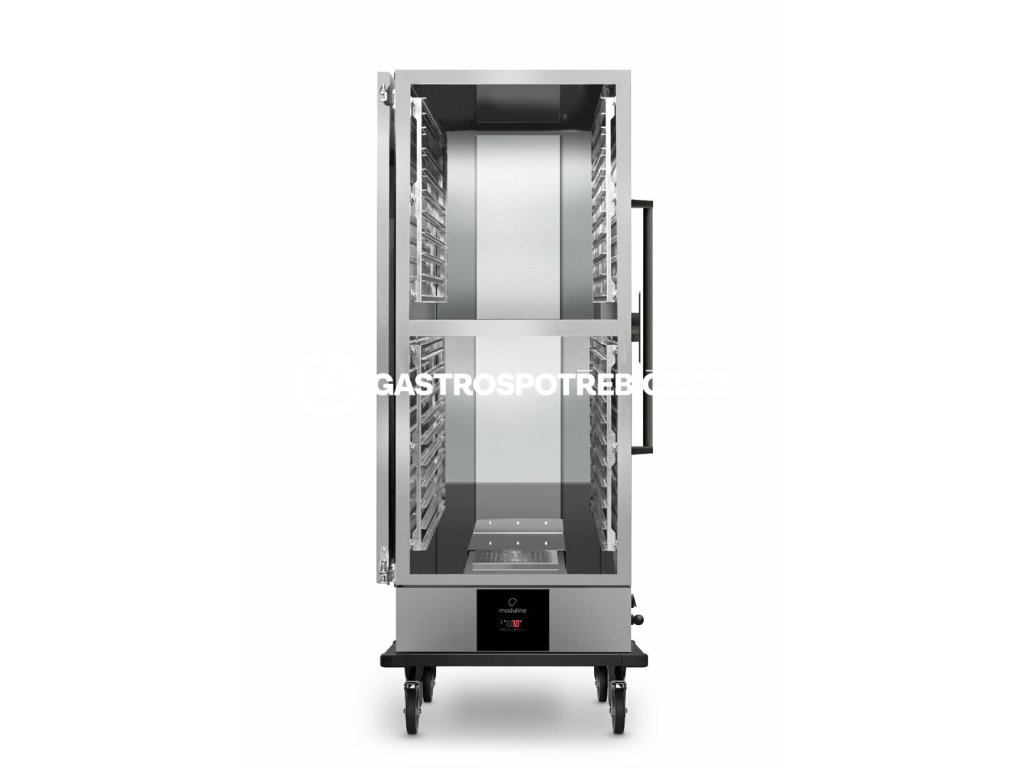 Moduline AIRFLOW+ je nová řada banketových vozíků s ventilovaným ohřevem pro catering. Modely AIRFLOW+ nabízí řadu ventilovaných vozíků, které jsou ideální pro rychlou obslužnost Transport, udržení a výdej teplého jídla v jídelnách, v hotelových konferenčních sálech, nemocnicích, domovech důchodců a dalších stravovacích provozech. Horký vzduch je vytvářen „zásuvkou Hot Box“ umístěnou ve spodní části vozíku a následně dynamicky distribuován do vzduchového dopravníku umístěného v zádech komory vozíku, tak aby se teplo rovnoměrně rozvádělo a rozprostřelo uvnitř komory a dostalo do všech zásuvů bez přímého proudění na jídlo. Tímto způsobem AIRFLOW+ zabraňuje nežádoucí dehydrataci a povrchovému připalování jídla, typický efekt mnoha ventilovaných vozíků. „Hot box“ je vybaven nádržkou na vodu pro možnost mechanického přivlhčování komory pomocí odpařování vody. Vozíky jsou vybaveny a řízeny digitálním regulátorem teploty (snadné ovládání), příplatkově může být vybaven Wifi modulem pro vzdálené připojením a ovládání zařízení pomocí cloudové aplikace (volitelné). Model ABK je v elegantním černém designu a výbavě, která zahrnuje lesklé černé plexi vnější panely se zaoblenými hranami, dlouhá postranní madla pro snadnou manipulaci a dále velký boční kabelový naviják. Funkční vlastnosti a výhody Regulace teploty +30 až +90 ºC pomocí digitálního ovládání, zobrazující nastavené a naměřené teploty (příplatkově ovládání s možností WI-FI dálkového přístupu a ovládání) Pro možnost mechanického přivlhčení v komoře je vozík vybaven vnitřní nádobou na vodu s ochranou proti přeplnění. Možnost uchovat potraviny s přidanou vlhkostí nebo bez ní výsledkem je flexibilita aplikace Distribuce vzduchu AIRFLOW+ s rovnoměrným a nepřímým rozptylem tepla, aby nedošlo k dehydrataci potravin Snadné vyjmutí „Hot boxu“, větrací sady a postranních zásuvů pro usnadnění čištění a údržbu Nízká hmotnost konstrukce s dlouhými bočními držadly pro snadnou manipulaci, také díky 4 otočným kolečkům (2 brzděná) Obvodové nárazníky pro ochranu těla zařízení a 2 dlouhé rukojeti pro usnadnění přepravy zařízení Dvířka jsou vybaveny 2 ručními odvětracími otvory pro manuální nastavení vlhkosti, odvlhčení. Otevírání dveří 270° s bočním magnetem pro udržení dveří otevřených během servisu nebo pohybu Nerezové komora je kvalitně utěsněná a provedena se zaoblenými rohy usnadňující čištění a zabraňující úniku vody Vyjímatelné a omyvatelné vnitřní zásuvy s roztečí 75mm. Kapacita GN dle modelu (10 x GN1/1 nebo GN2/1; 20x GN1/1 a GN2/1). (příplatkově lze dodat zásuvy s větší roztečí 90mm a kapacitou 8x GN nebo 16x GN)Doplňkové parametry