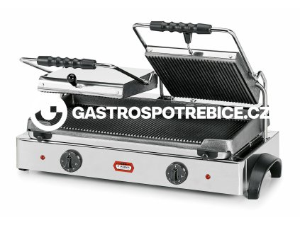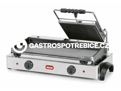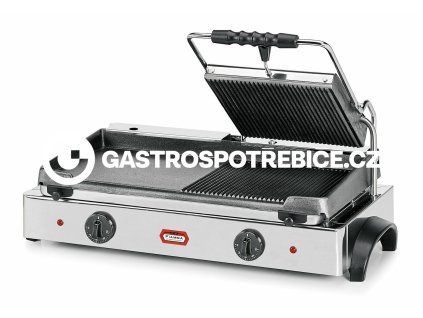 Elektrický kontaktní gril 2/3 GR 6.1. Kontaktní plochy: Horní - rýhovaná Spodní - rýhovaná robustní celonerezové provedení odkapová miska kontaktní plochy - litina s...