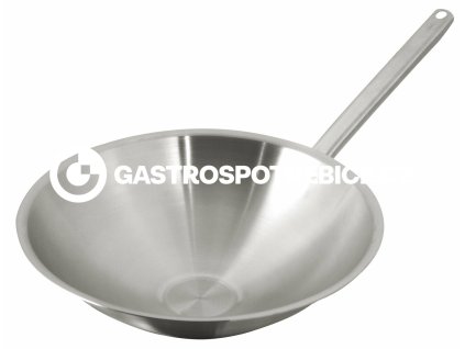 Profesionální pánev WOK z nerez materiálu o tloušťce 1,2 mm s oblým dnem je určená pro všechny druhy plynových sporáků.